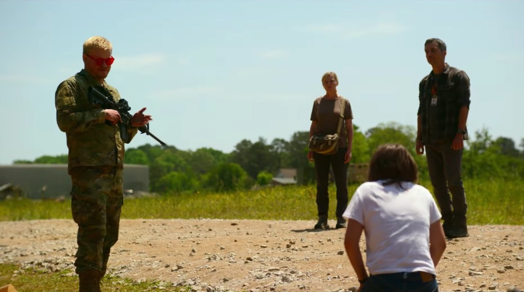 Una de las escenas más tensas de la película al coincidir con unos militares en un lugar perdido en medio de la ruta de los personajes