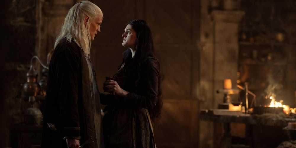 ¿Qué tal si recapitulamos? Daemon Targaryen (Matt Smith) sigue en Harrenhal siendo torturado por sus errores, mujeres del pasado y del presente. Alucinaciones que con toda certeza son propinadas por la misma Alys Rivers (Gayle Rankin) “La bruja de Harrenhal”. Debo comentar que esta trama original de la serie me parece buenísima, porque tenemos momentos en los que podemos desarrollar más al príncipe canalla, aprovechando que está completamente solo en los pasillos del no tan tranquilo castillo. Les comenté que Daemon estaba teniendo visiones de las mujeres de su pasado y presente debido al «ambiente del castillo”… Pues una de sus visiones es con una Rhaenyra Targaryen joven (Milly Alcock. Esta visión nos indica que en el caso de que llegue a traicionar a la reina, él no estaría traicionando a la reina ya de adulta (Emma D’Arcy) sino más bien a esa joven princesa a la que todos le juraron lealtad. Una reina sin ningún ejército o experiencia, que solo contaba con la bendición del rey (Paddy Considine) y el favoritismo de su tío.