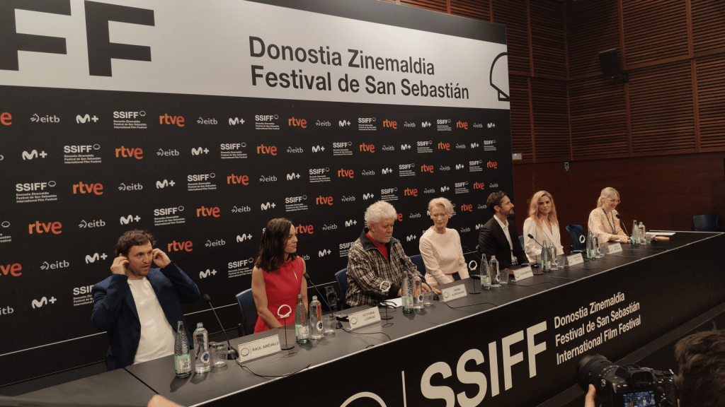 La rueda de prensa de La habitación de al lado movilizó a toda la prensa presente en el festival. Entre entregas de conchas de oro falsas y bolígrafos de restaurantes, Pedro se mostraba emocionado por todo lo que ocurría a su alrededor durante esta edición del Zinemaldia: la entrega del Premio Donostia a su carrera, el estreno de su nueva película, el 44º aniversario del estreno de Pepi, Luci, Bom y otras chicas del montón en ese mismo festival, y la celebración de su 75º cumpleaños.