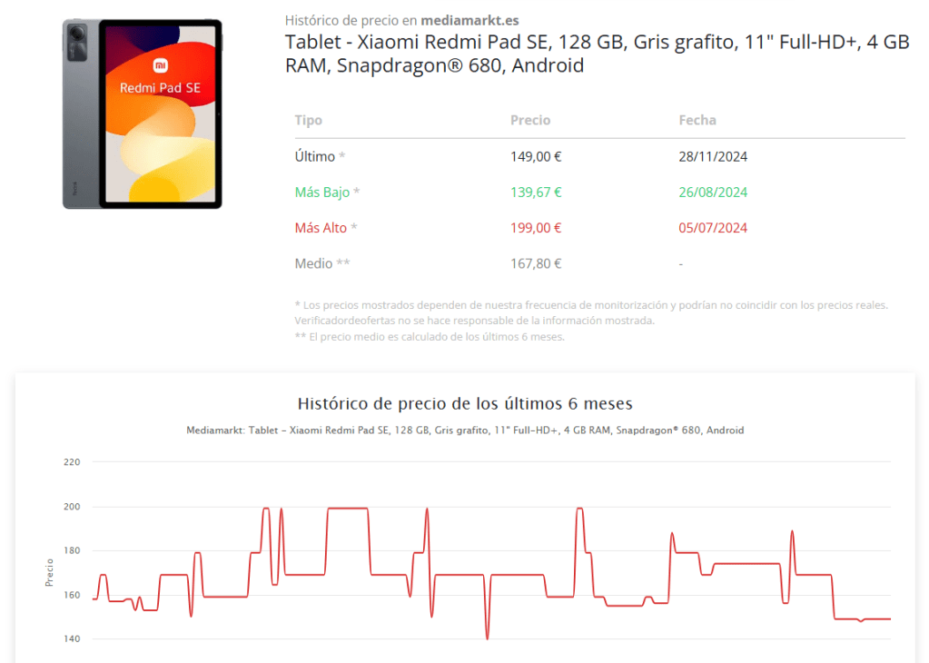 La web nos da todos los detalles del precio que tiene y ha tenido el producto, incluyendo un histórico de los últimos 6 meses, monitorizado por el sistema.